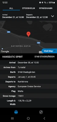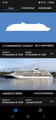 The Cruise Stockholm app shows the vessels in port, as well as those due to arrive into Stockholm and Nynäshamn. You can also see what berth the vessels occupy. Information is updated every five minutes.