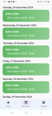 • 7-Day Forecast Tailored for Riders: Plan your week with detailed forecasts highlighting the best and worst riding times.