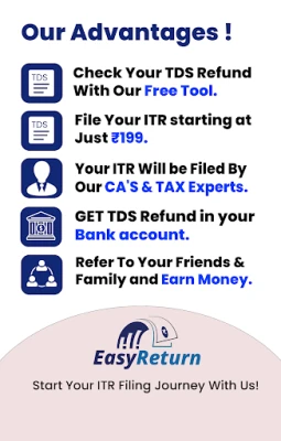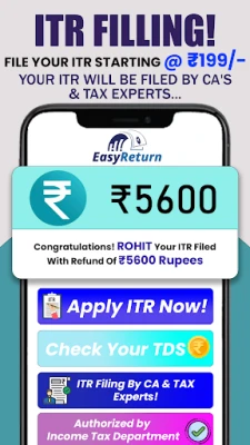 Looking to file your Income TAX Return quickly and easily? Our Easy Return App By Easy Return Inc provides ITR Filing by CA and TAX Experts starting at just ₹399/- Whether you're filing a new ITR or Revised a Defective ITR File, our CA's & TAX Experts are here to assist you.