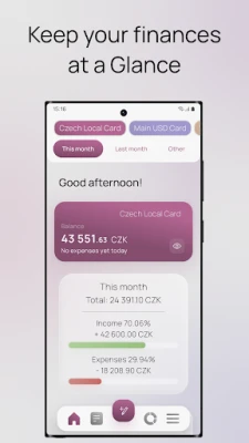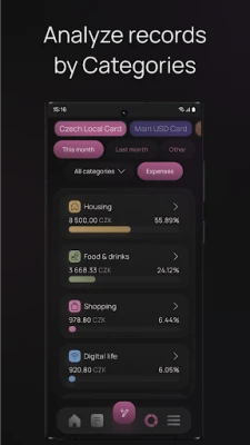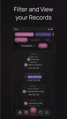 View your recent records on the app home screen or go to a separate screen to view all of your records. View statistics by categories and subcategories to see how much you have spent on items within different categories. Easily filter categories by your collections. View these statistics by specifying the period: this month, last month, a specific month of a specific year, or a completely custom period.