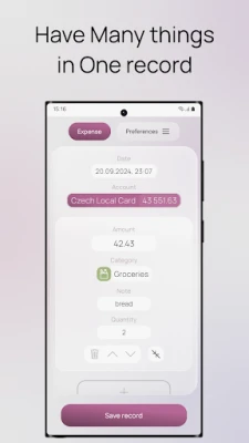 Make a record of an expense or income by specifying the record category, amount, note, and quantity of what you have bought. You can include multiple items in one record because when you buy something, it may not necessarily belong to just one category.