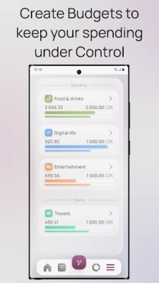 Create budgets for a specific period and category and choose which accounts to link them to. When creating a record, choose whether to include it in the budgets. View statistics for your budgets at once or view detailed data by current and past periods for each budget separately.