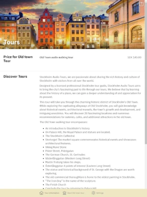Explore the charming streets of Stockholm at your own pace with our audio walking tour. Immerse yourself in the rich history and vibrant culture of the city as you stroll through iconic landmarks and hidden gems. Simply download the tour on your phone, put on your headphones, and let our expertly curated guide lead the way. Whether you're a history buff, a culture enthusiast, or a curious traveller, our Stockholm audio walking tour offers a unique and memorable experience for all.