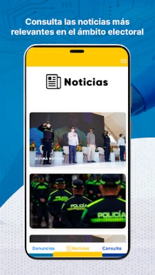 El ciudadano al abrir la aplicación encontrará una pantalla de bienvenido la cual cambiará cuando se cargue y mostrará la pantalla de inicio en la que el usuario debe solucionar el captcha, presionar el botón ingresar y aceptar los términos y condiciones que se describen para el uso de la aplicación. Una vez acepte los términos podrá visualizar las noticias de las elecciones y en la parte inferior podrá dirigirse a la opción de denuncias o consulta.