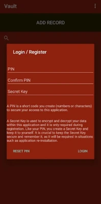Once registered, users can log in with their PIN to access the app and view their stored records.